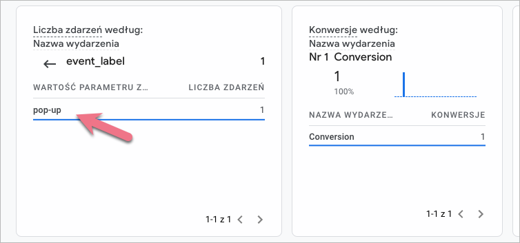 4. Aby sprawdzić nazwę pop-upu, kliknij Conversion, a następnie event_label.
