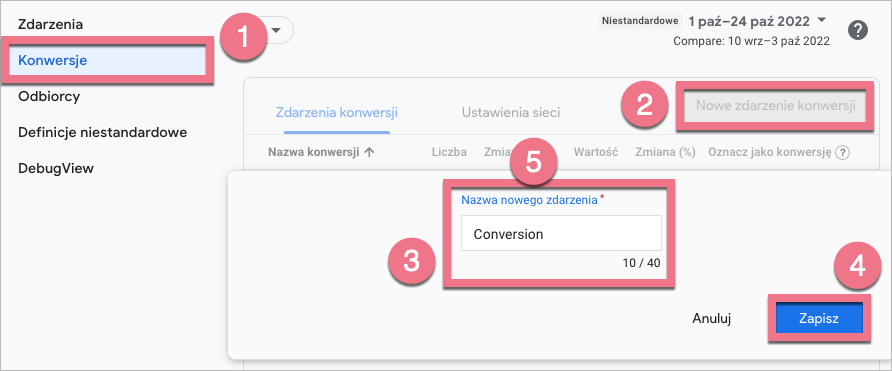 Przejdź do sekcji Konfiguracja, następnie przejdź do zakładki Konwersje (1) > kliknij Nowe zdarzenie konwersji (2) > wpisz Conversion (3) > i Zapisz (4).