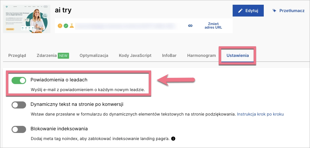 2. Wejdź w Ustawienia, przewiń w dół i włącz opcję Powiadomienia o leadach (Wyślij e-mail z powiadomieniem o każdym nowym leadzie).