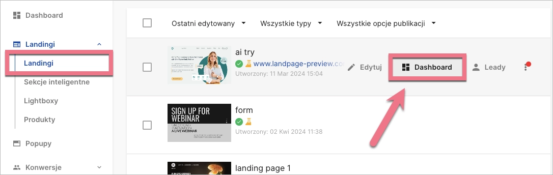 1. Przejdź do zakładki Landingi. Wejdź do Dashboardu landing page’a, dla którego chcesz ustawić powiadomienia o leadach. Jeśli chcesz otrzymywać powiadomienia dla lighboxa, włącz funkcję dla landing page’a, na którym użytkownik może wywołać danego lightboxa.