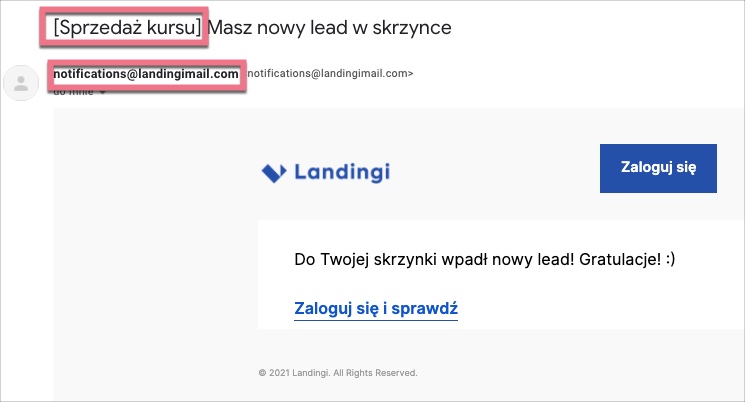 Po wygenerowaniu nowego leada na landing page’u lub lightboksie, na adres e-mail właściciela konta będzie wysyłana wiadomość mailowa z adresu: notifications@landingimail.com. W tytule znajduje się nazwa landing page’a.