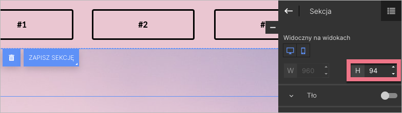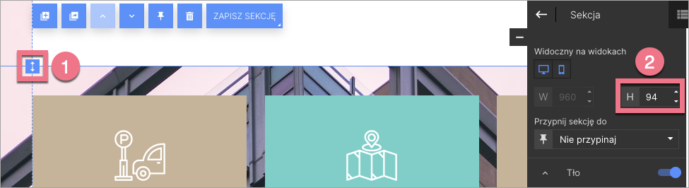 3. Ustaw pożądaną wysokość sekcji za pomocą suwaka (1) lub zmiany wartości w panelu bocznym (2).