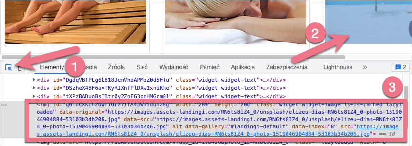 2. Zobaczysz okno z kodem HTML strony. Kliknij na narzędzie zaznaczenia (1) i najedź kursorem na obraz (2), aby podświetlić część kodu (3), która za niego odpowiada.