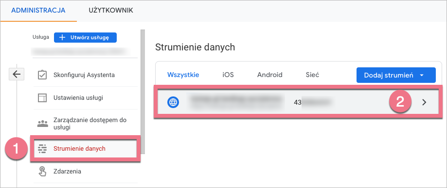 1. W panelu Google Analytics 4 przejdź do usługi odpowiedzialnej za Twój landing page. Kliknij Strumienie danych (1) i wybierz strumień (2).