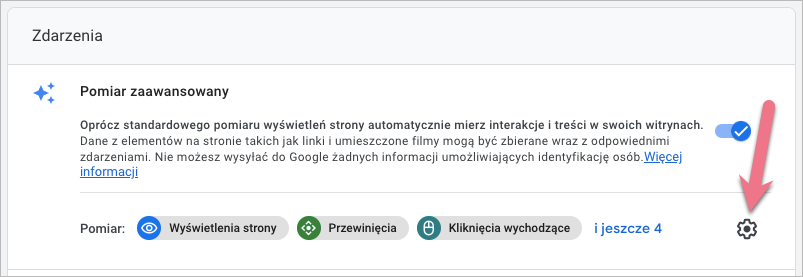 Google Analytics 4 udostępnia wiele gotowych opcji śledzenia zdarzeń na stronie – najważniejsze (takie jak wyświetlenia strony, przewinięcia czy wypełnienia formularza) są dostępne od razu po włączeniu Pomiaru zaawansowanego. Śledzenie innych zdarzeń jest możliwe po skonfigurowaniu dodatkowych tagów i reguł (jak np. śledzenie kliknięć przycisków przekierowujących na domenę poza Twoim landing page’em).