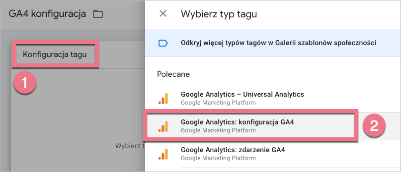 4. Kliknij Konfiguracja tagu (1) i wybierz Google Analytics: konfiguracja GA4 (2).