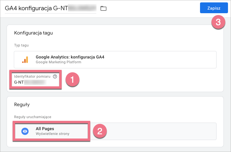 5. Wklej skopiowany Identyfikator pomiaru (1). Wybierz All Pages (2) jako Regułę. Następnie nazwij tag i zapisz (3).