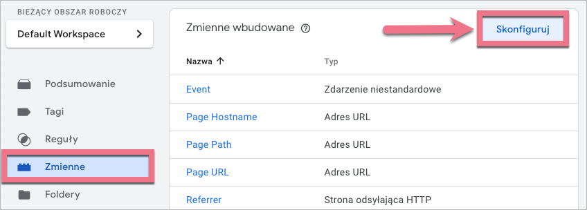 1. W panelu GTM przejdź do zakładki Zmienne i kliknij Skonfiguruj.