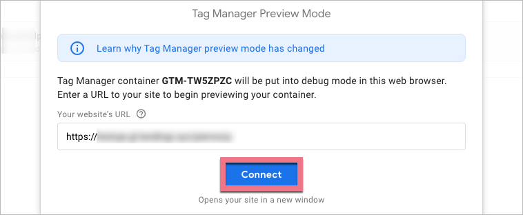 6. Kliknij Podgląd. Zobaczysz okienko Tag Assistant: wklej adres URL swojego landing page’a i kliknij Connect (Połącz), a następnie Continue (Kontynuuj).