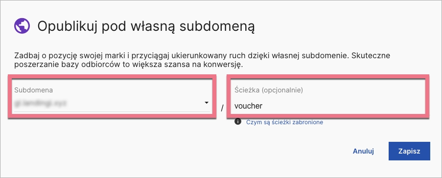 3. Wybierz subdomenę z listy (1). Możesz dodać opcjonalną ścieżkę (2) – wtedy pod jedną domeną albo subdomeną możesz opublikować więcej landing page’y. Kliknij Zapisz.