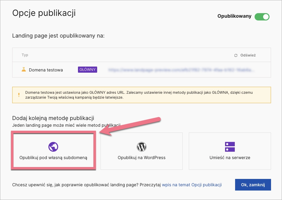 2. Kliknij Opublikuj pod własną domeną.
