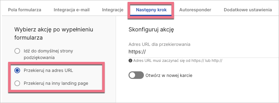 3. Wybierz Przekieruj na adres URL lub Przekieruj na inny landing page. Wklej adres wybranej strony lub wybierz landing page’a.
