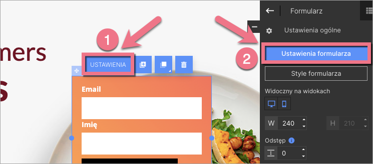 1. Aby wybrać, gdzie zostanie przekierowany użytkownik po wypełnieniu formularza, wejdź w jego Ustawienia z menu podręcznego (1) lub panelu bocznego po prawej stronie edytora (2).