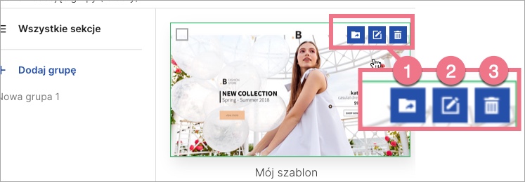 3. Kliknij w wybrany szablon. Możesz przypisać go do wybranej grupy (1), zmienić nazwę (2) lub usunąć (3).