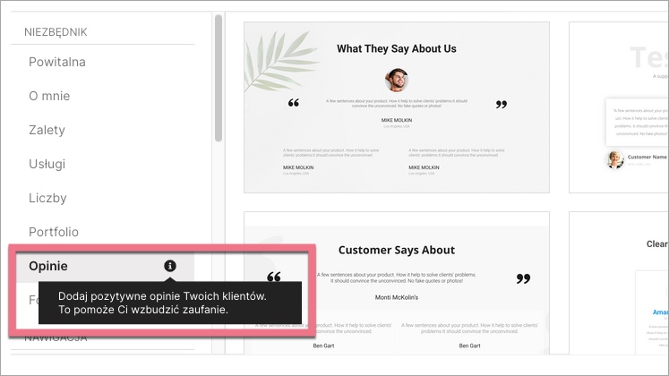 3. Po lewej stronie znajdziesz kategorie. Dzięki temu stworzysz profesjonalny landing page, który będzie zawierał wszystkie niezbędne elementy.
