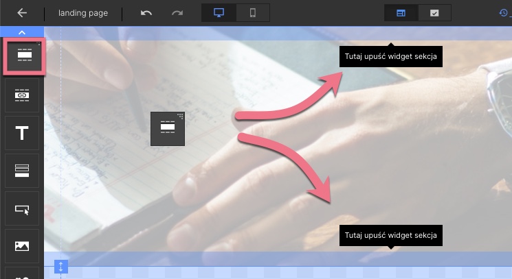 1. Po lewej stronie edytora odszukaj widget Sekcja, następnie przeciągnij go i upuść w obszar aktywny Twojego landing page’a.