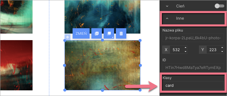 2. W toolbarze po prawej stronie odszukaj zakładkę Inne. Wpisz card w polu Klasy.