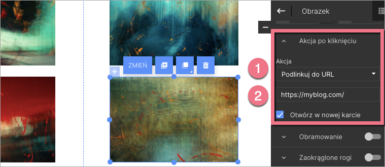 3. Jeżeli chcesz dodać do obrazka link przekierowujący, odszukaj zakładkę Akcja po kliknięciu, wybierz Podlinkuj do URL (1) z listy rozwijanej i wklej swój link (2). W zależności od potrzeb zaznacz opcję Otwórz w nowej karcie.