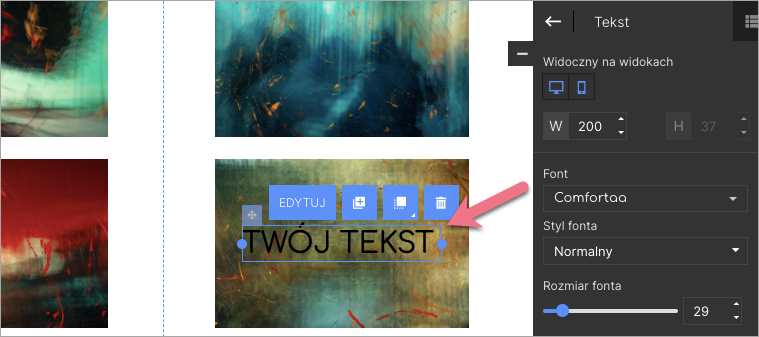 4. Aby dodać tekst, który będzie widoczny po najechaniu kursorem na element, odszukaj widget Tekst, następnie przeciągnij go i upuść w obszar aktywny Twojego landing page’a.