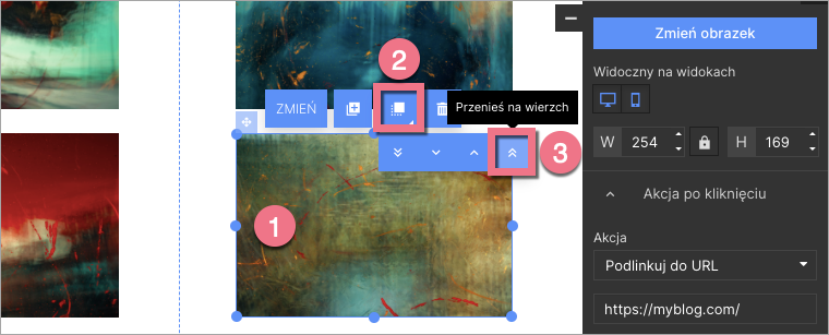 6. Następnie kliknij element pod tekstem (1), wybierz Zmień warstwę (2) i kliknij Przenieś na wierzch (3).