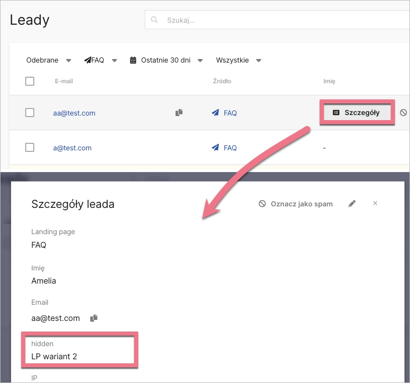 Żeby przy leadach znajdowała się informacja, z którego wariantu landing page’a pochodzą, dodaj do formularzy pola ukryte i nadaj im wartości, które pozwolą rozróżnić poszczególne warianty. Użytkownicy nie zobaczą ukrytego pola w formularzu, ale nadana mu wartość przypisze się do leada.