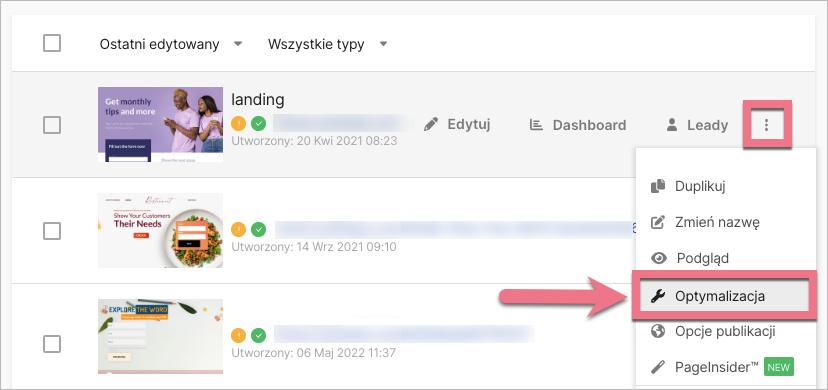 1. Zaloguj się na swoje konto w Landingi. Wybierz swój landing page z listy, kliknij Więcej (ikona trzech kropek) i wybierz Optymalizacja.