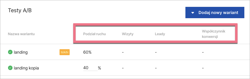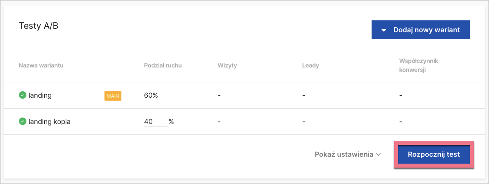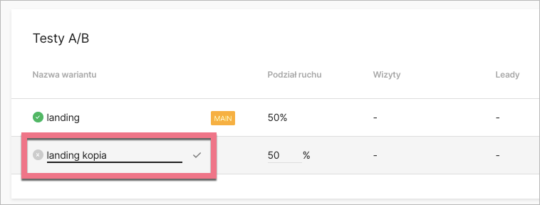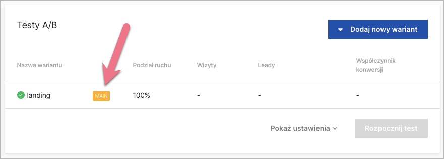 1. Główny wariant jest oznaczony jako Main i domyślnie jest to ten landing page, z poziomu którego rozpoczynasz test. Możesz go dowolnie zmieniać przed, w trakcie i po zakończeniu testu.