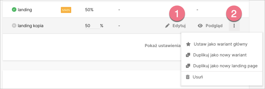 - Duplikuj jako nowy landing page – tworzy z danego wariantu nowy landing page, z osobnymi statystykami oraz innym adresem URL. Ta opcja jest przydatna, jeśli któryś z testowanych wariantów chcesz opublikować jako osobny landing page.