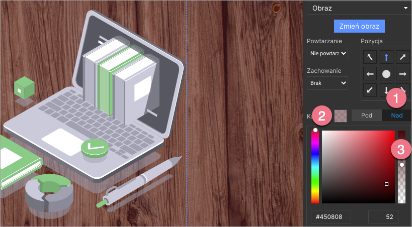Wybierając obraz jako tło, możesz także nałożyć na niego warstwę koloru. Kliknij Nad (1), wybierz kolor (2) i ustaw poziom przeźroczystości (3).