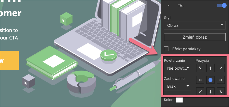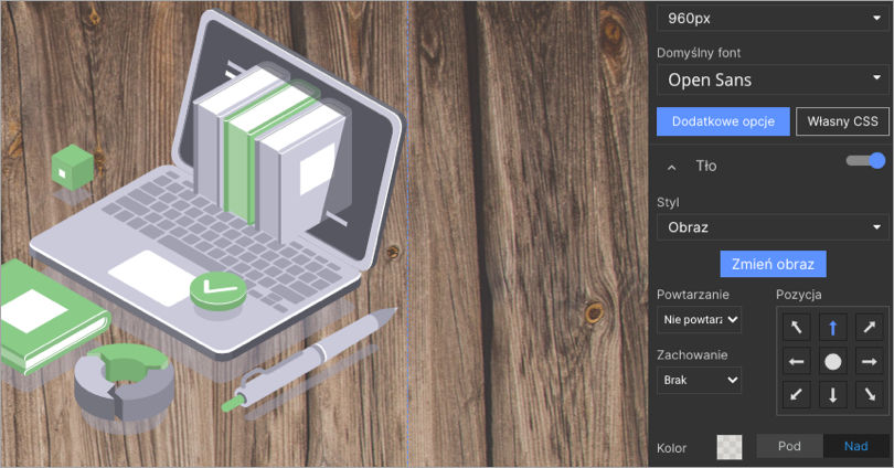 Pozycję i zachowanie obrazka w tle możesz ustalić samodzielnie, korzystając z opcji dostępnych w panelu po prawej stronie edytora.