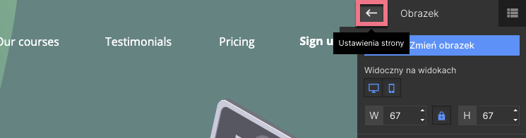 W trakcie edycji możesz wrócić do Ustawień strony, klikając w strzałkę: