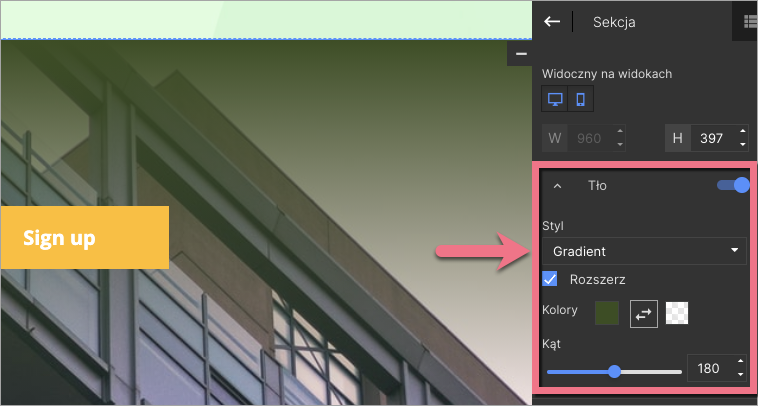 Aby obrazek tła landing page’a był widoczny pod gradientem, ustaw całkowitą przeźroczystość dla jednego z kolorów.