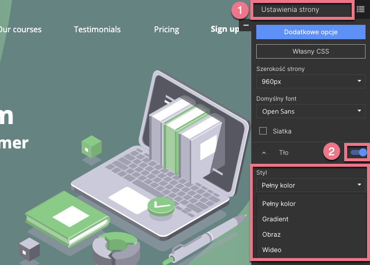 W Ustawieniach strony (1) po prawej stronie za pomocą suwaka włącz Tło (2). Wybierz Styl tła. Masz do wyboru aż cztery rodzaje tła – pełny kolor, gradient, obraz i wideo (z YouTube lub Vimeo).