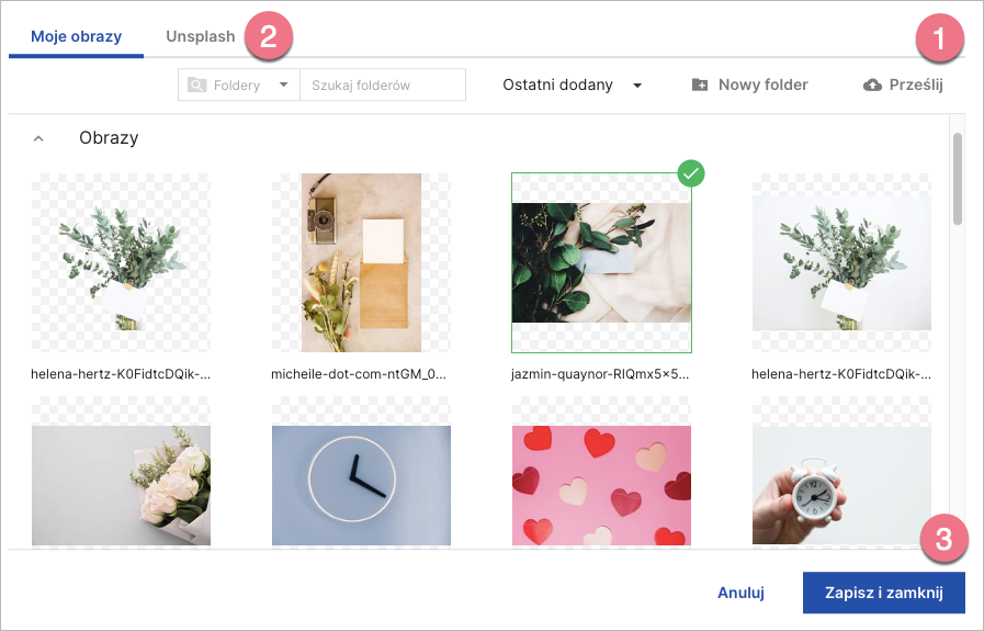 Jeżeli wybierzesz obraz, możesz wgrać zdjęcie z komputera (1) lub skorzystać z galerii darmowych obrazów Unsplash (2). Unsplash to platforma z darmowymi obrazami w wysokiej rozdzielczości. Możesz używać, kopiować i modyfikować pobrane obrazy bezpłatnie.