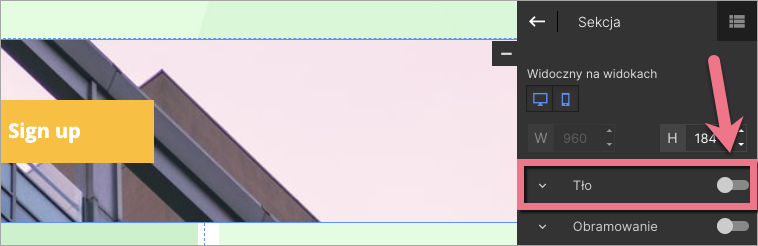 WSKAZÓWKA: Jeżeli pracujesz na szablonie landing page’a i tło nie jest widoczne na poszczególnych sekcjach, kliknij wybraną sekcję i w jej ustawieniach po prawej stronie za pomocą suwaka wyłącz tło.