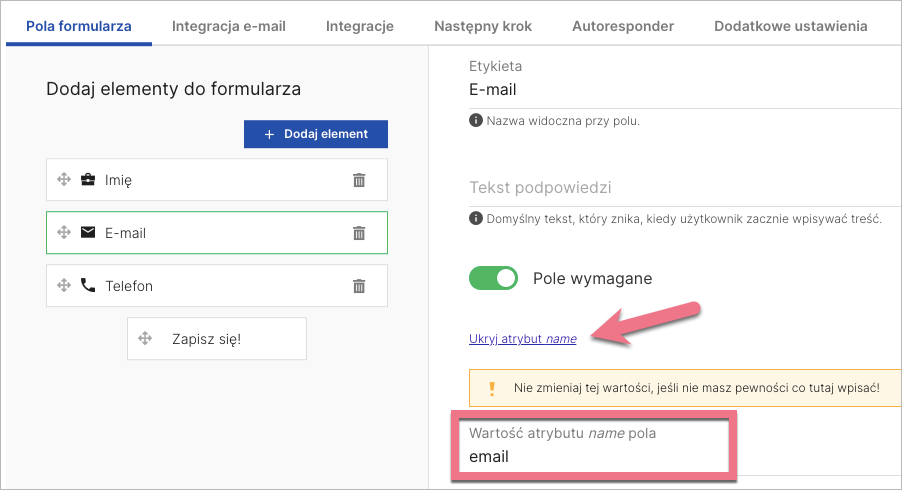 3a. W zakładce Pola formularza kliknij na pola, których dane mają być przesyłane do LP2. Rozwiń Pokaż atrybut name i skopiuj wartość atrybutu dla każdego takiego pola.