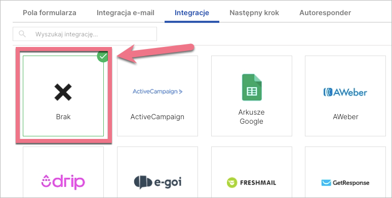 3b. W zakładce Integracje zaznacz Brak.
