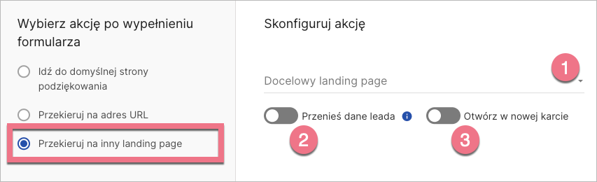 Jeśli chcesz połączyć razem kilka landing page’y, możesz wybrać, czy dane leada zostaną przeniesione z obecnego landing page’a do następnego. Aby tak się stało, zaznacz checkbox Przenieś dane leada (2). Możesz także ustawić otwieranie landing page’a w nowej karcie (3).