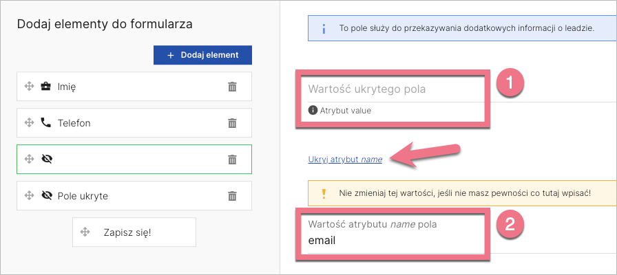 6b. Dla każdego ukrytego elementu pozostaw pole atrybutu value (1) puste. Kliknij Pokaż atrybut name i wklej (2) odpowiednie wartości skopiowane z LP1, np. name lub email. Powtórz dla każdego ukrytego pola.