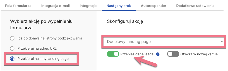 3c. W zakładce Następny krok wybierz Przekieruj na inny landing page i wybierz z listy LP2. Upewnij się, że opcja Przenieś dane leada jest zaznaczona.