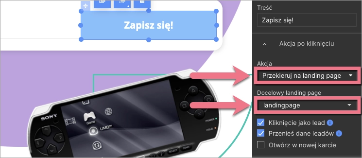 3. Kliknij w Kliknięcie jako lead, a opcja Przenieś dane leadów uaktywni się. Kliknięcia w przycisk będą zliczanie jako konwersja w statystykach landing page’a. Domyślnie dla wszystkich landing page’y celem konwersji jest wypełnienie formularza. Jeśli na jednym landing page’u masz zarówno przycisk, jak i formularz, zaznaczenie opcji śledzenia kliknięć jako leadów spowoduje, że w statystykach landing page’a konwersje będą sumowane i podawane zbiorczo.