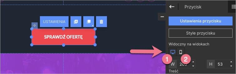 3. W panelu po prawej stronie kliknij w ikonę monitora (dla widoku desktopowego) (1) lub smartfona (dla widoku mobilnego) (2) w zależności od tego, na jakim widoku chcesz ukryć wyświetlanie elementu. Biała ikona (2) oznacza, że element jest niewidoczny na wybranym widoku.
