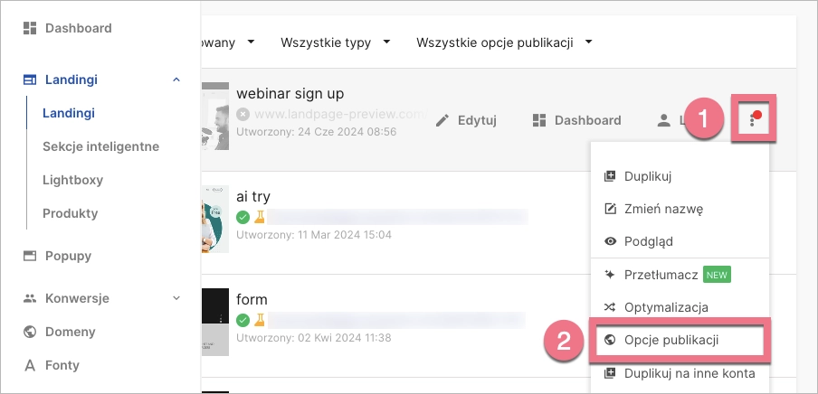 2. Na liście wszystkich landing page’y znajdź ten, który chcesz umieścić na swoim serwerze, i kliknij Więcej (1) (ikona trzech kropek). Z rozwijanego menu wybierz Opcje publikacji (2).
