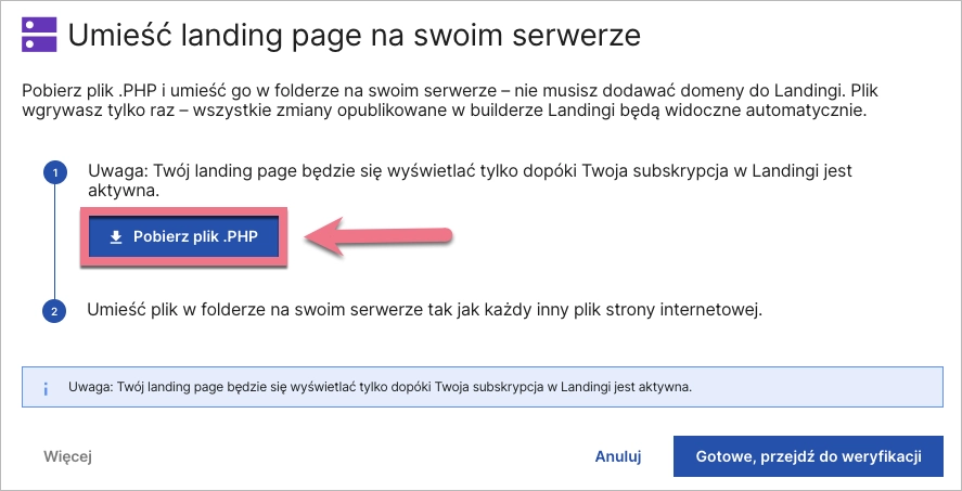 Jeśli nie chcesz korzystać z opcji hostingu na serwerach udostępnionych przez Landingi, możesz umieścić landing page na własnym serwerze.