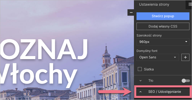 1. W edytorze odszukaj i rozwiń zakładkę SEO / Udostępnianie (w Ustawieniach strony).