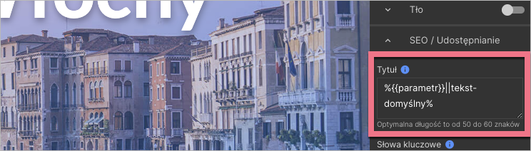 Przykładowo tytuł może wyglądać następująco: %{{title}}||Poznaj piękno Włoch!% – domyślnym tytułem strony będzie wtedy Poznaj piękno Włoch!