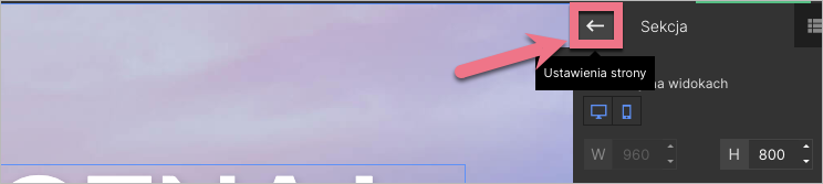 W trakcie edycji do Ustawień strony przejdziesz, klikając na strzałkę: