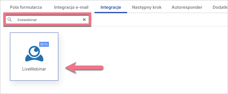 3. W zakładce Integracje wybierz LiveWebinar. Wpisz nazwę integracji w wyszukiwarce i kliknij enter.