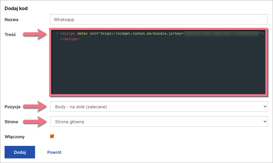 3. Nadaj Nazwę i wklej skopiowany wcześniej kod w pole Treść. Wybierz pozycję Body – na dole i Stronę główną. Zapisz, klikając Dodaj.