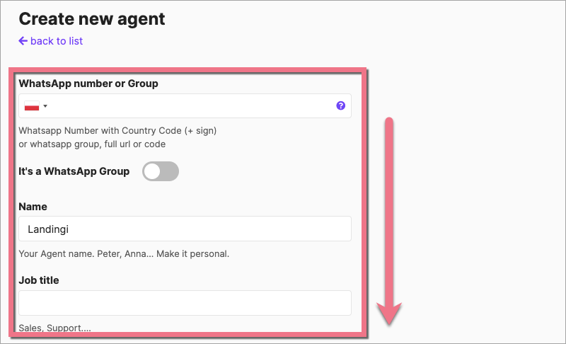 4. Na następnej stronie Create new agent wypełnij pola danymi nowego agenta (więcej pól znajdziesz po zeskrolowaniu w dół).